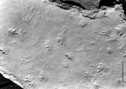 Over de moddervlakte liepen allerlei dieren. Ze zakten een beetje in de modder en lieten zo hun pootafdrukken achter. Als deze modder droog viel, traden er krimpscheuren op tussen de verschillende lagen. Dankzij de krimpscheuren is de klei makkelijk te splijten. Wanneer je dat doet, kun je fraaie pootafdrukken te zien krijgen van de dieren die over de moddervlakte liepen.